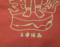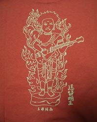 エンケンTシャツ後ろのアップです。 こちらが後ろ。 遠賢明王が大きく描いてあります。 顔もエンケンさんによくにています。 下には"三浦純画"と書いてあります。 いままでひらがなでしか見たこと有りませんでしたのでなんだか新鮮に感じました。 顔も似ていますよね? |