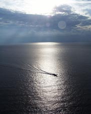 ここからの眺めは地球はホントに丸いのではないか?と僕に実感させてくれるようです。見渡す限りが海で、水平線が限りなく続いているかのよう。そんな中たまたま一隻の漁船が通ってくれました。